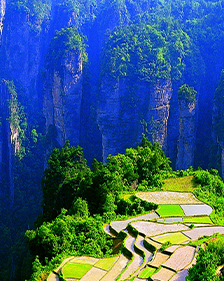 張家界,是湖南一個著名的風(fēng)景區(qū),一座天然的森林公園。黃石寨、天子山、金鞭溪等勝境,是令游人心馳神往之地。在我們出發(fā)之初,心就早已高高飛揚,五個多小時的顛簸終于把我們載到了目的地,導(dǎo)游是一個年輕的女孩子,一見面就放開歌喉唱了首當(dāng)?shù)赝良易宓母柚{,歌聲婉轉(zhuǎn)動聽,一下子讓我們領(lǐng)略到了鄉(xiāng)村